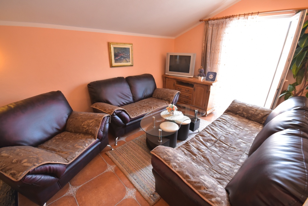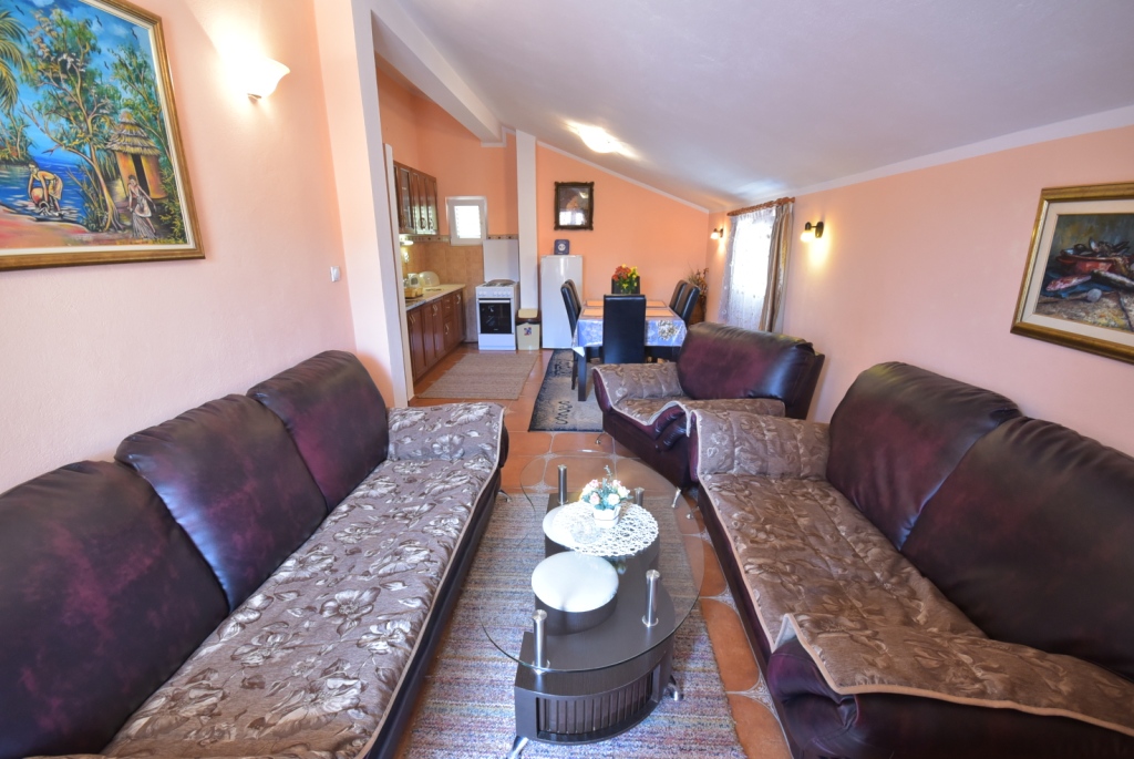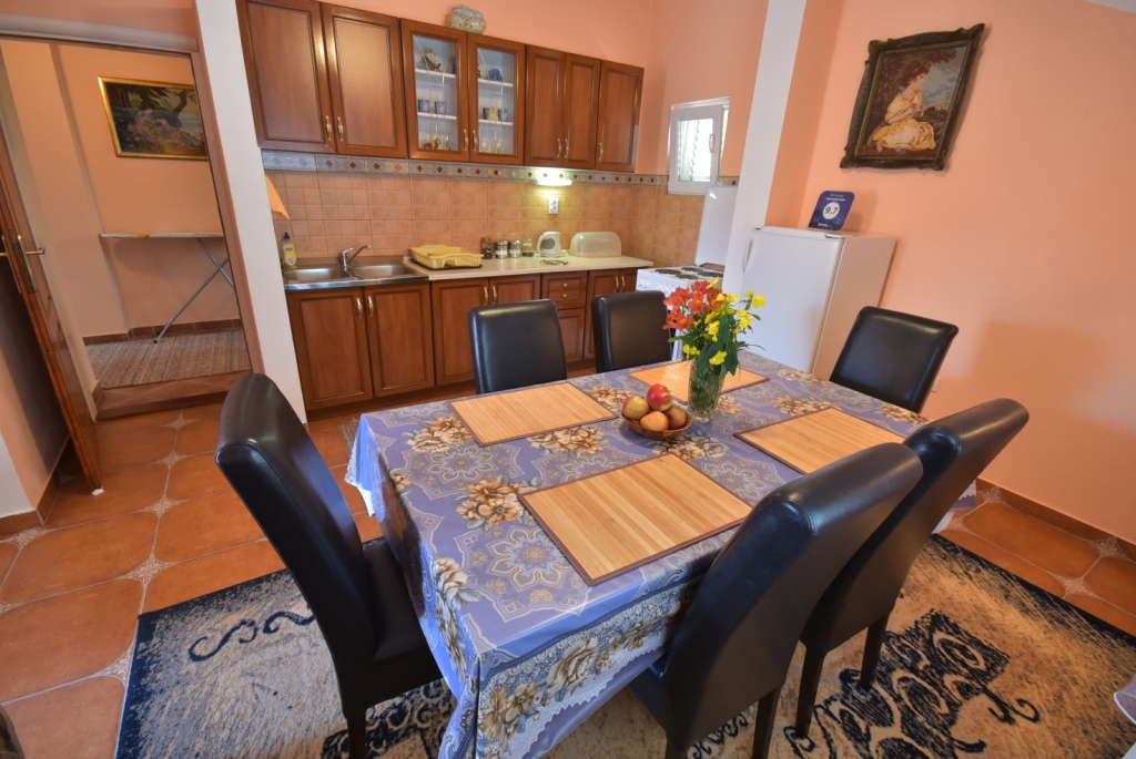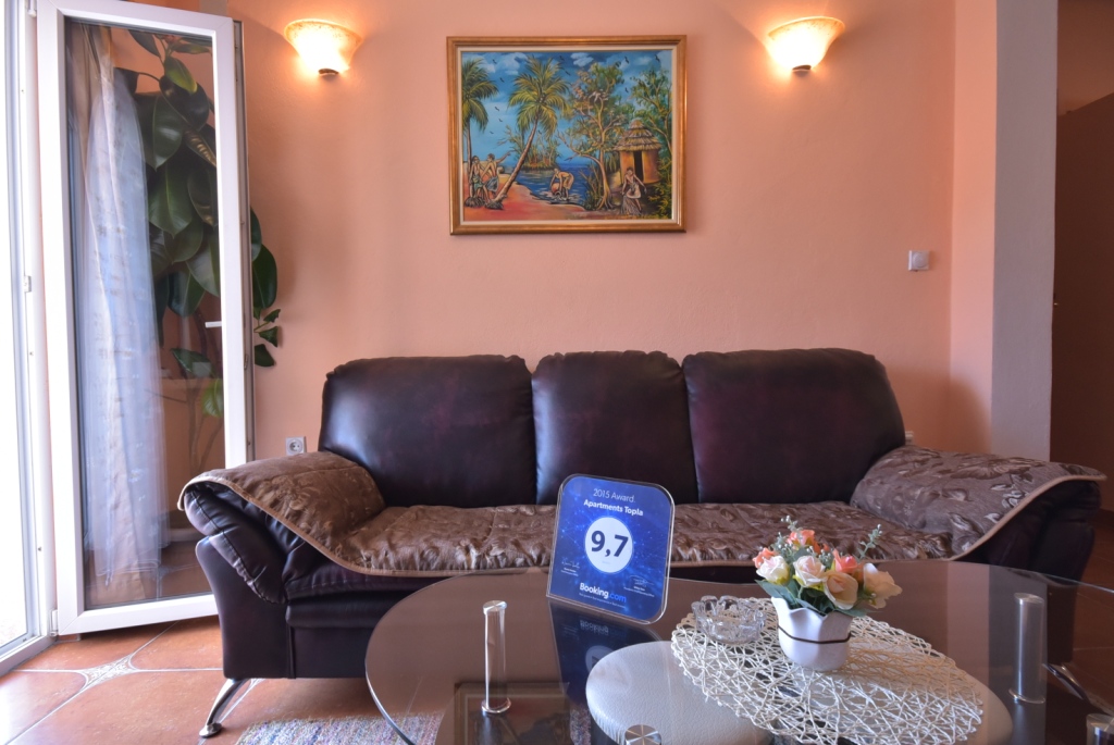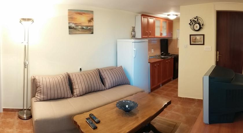 1/3 apartman sadrži: spavaću sobu sa bračnim ležajem, dnevni boravak sa trosjedom na izvlačenje, kuhinju, kupatilo, terasu, klimu, satelit TV, wi-fi internet itd.